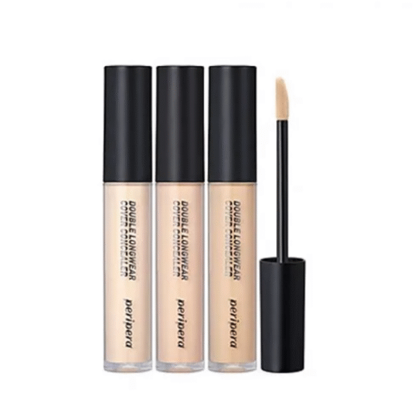 Aplica un corrector de larga duración como el Peripera Double Longwear Cover Concealer en el párpado móvil y difumina bien. Esto crea una base uniforme y evita que las sombras se corran.