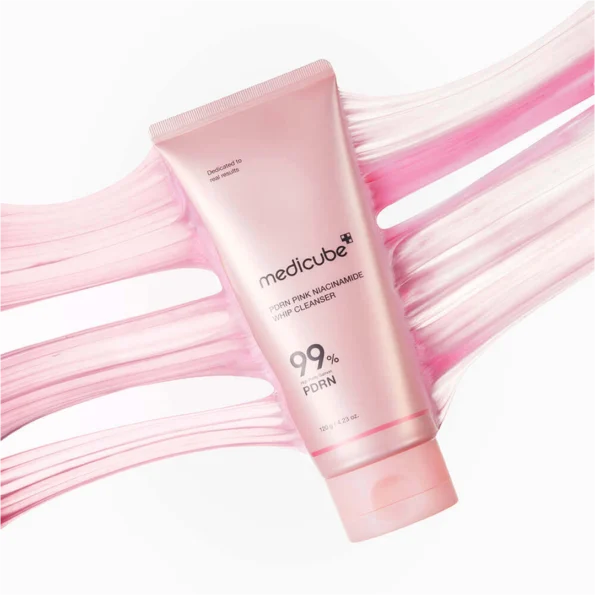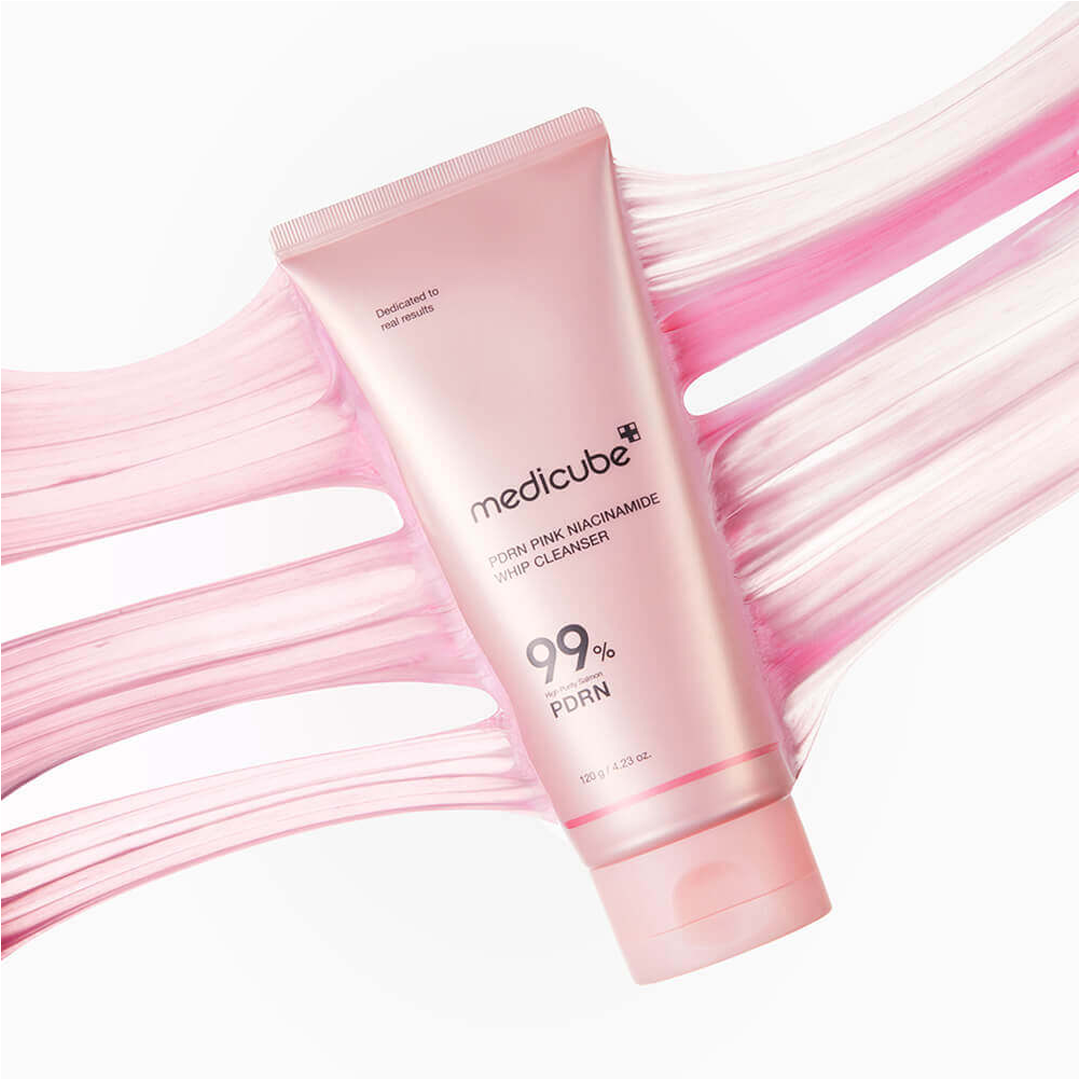 Una espuma limpiadora con textura whip, es decir, tipo crema batida: densa, elástica y ultrasuave. El Medicube PDRN Pink Niacinamide Whip Cleanser transforma tu rutina en una experiencia sensorial y efectiva. Al aplicarlo, se comporta como un gel denso que se “estira” ligeramente sobre la piel seca, y al contacto con el agua, se transforma en una espuma fina y aireada que limpia a fondo sin resecar.