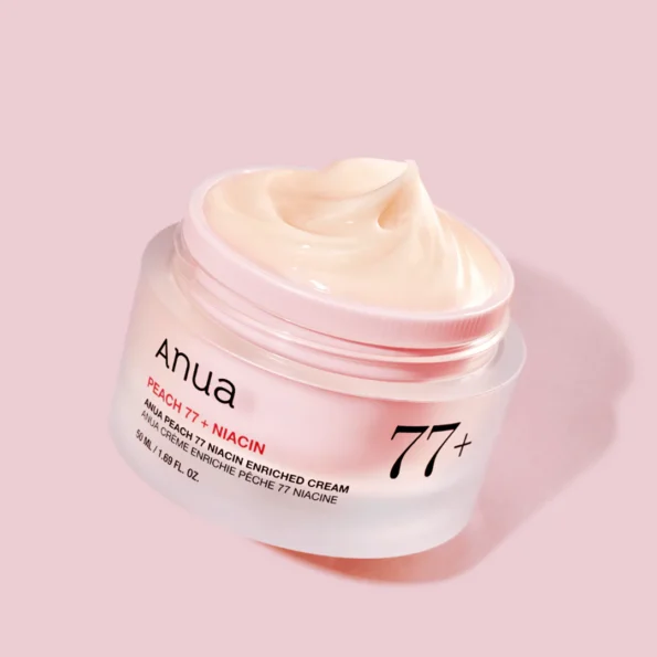 La ANUA Peach 77 Niacin Enriched Cream es una crema hidratante coreana de textura ligera tipo pudding, formulada con un 77 % de extracto de durazno que hidrata intensamente sin dejar sensación pesada. Enriquecida con niacinamida, ceramidas, colágeno y pantenol, esta crema ayuda a mantener la piel luminosa, suave y equilibrada 🍑✨