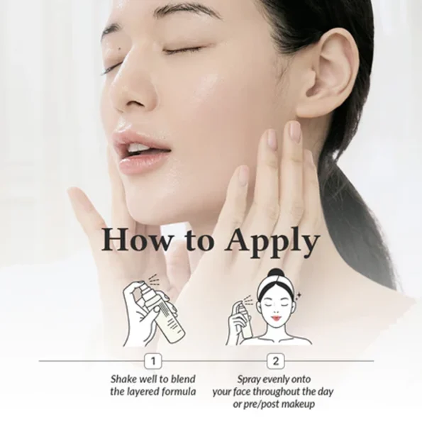 Agitá bien para mezclar las capas. Pulverizá a unos 20 cm del rostro con los ojos cerrados. Usala después de limpiar la piel, para fijar el maquillaje o cada vez que necesites refrescar e hidratar.