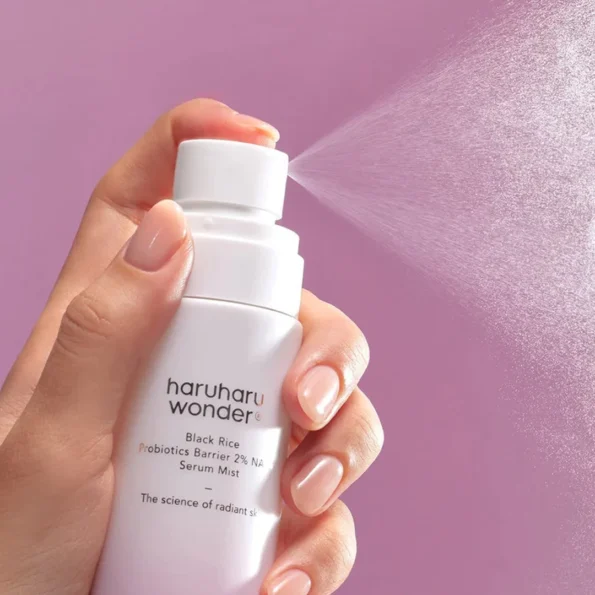 Serum mist de Haruharu Wonder con arroz negro fermentado, probióticos y NAD+ diseñado para aportar hidratación ligera y refrescar la piel durante el día.