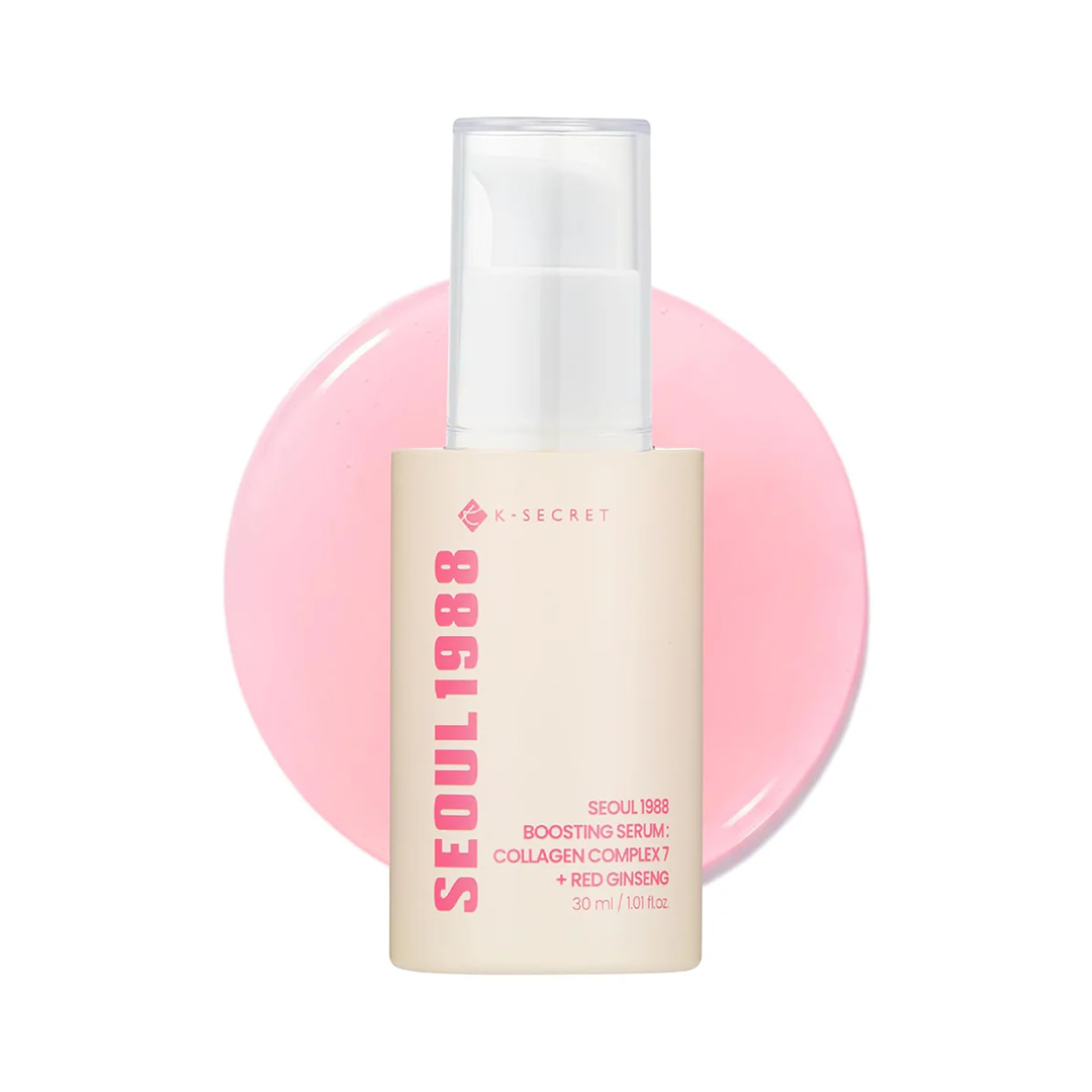 El K‑Secret Seoul 1988 Collagen Boosting Serum es un suero facial coreano diseñado para mejorar la elasticidad, firmeza e hidratación de la piel. Su fórmula combina un complejo de 7 tipos de colágeno, extracto de ginseng rojo y activos hidratantes como niacinamida, ceramidas y esqualano, que trabajan en sinergia para revitalizar la piel, mejorar la textura y aportar un aspecto más saludable y juvenil.