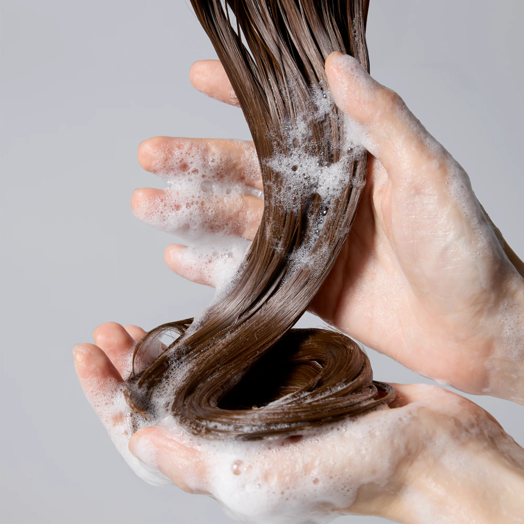 - Aplicá una pequeña cantidad de MOEV Annurcatin Shampoo y masajeá suavemente desde el cuero cabelludo hasta las puntas.