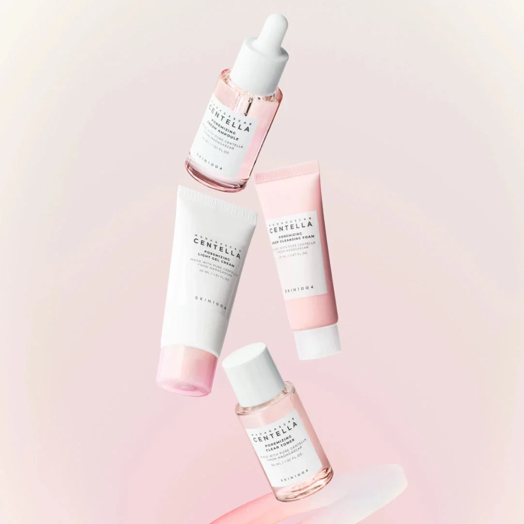 El SKIN1004 Madagascar Centella Poremizing Travel Kit incluye cuatro productos en tamaño viaje de la línea Poremizing para realizar una rutina básica de cuidado facial.