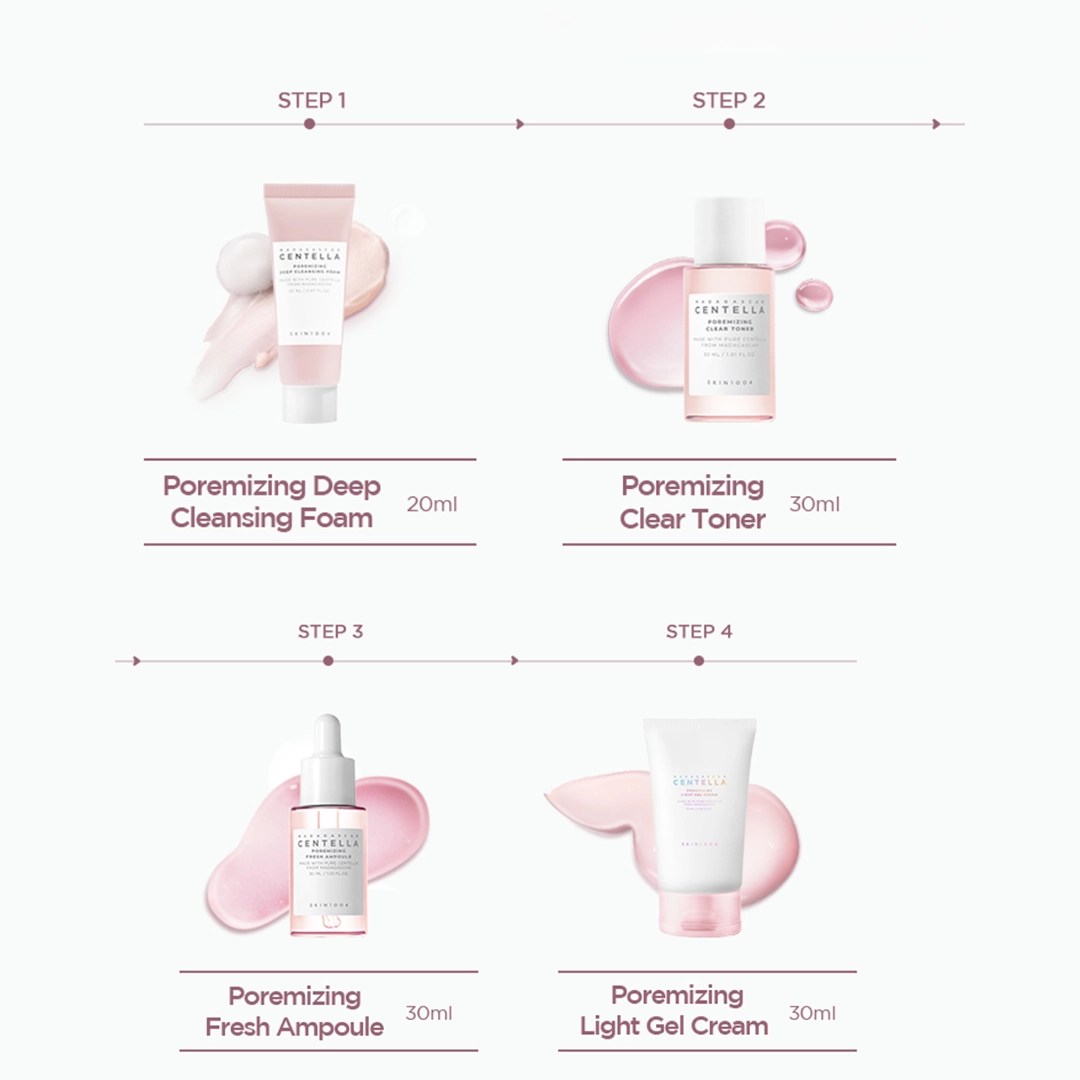 El SKIN1004 Madagascar Centella Poremizing Travel Kit es un set en tamaño viaje que reúne cuatro productos esenciales de la línea Poremizing de SKIN1004. Este kit permite probar una rutina básica de la línea o llevar los productos fácilmente durante viajes o escapadas.