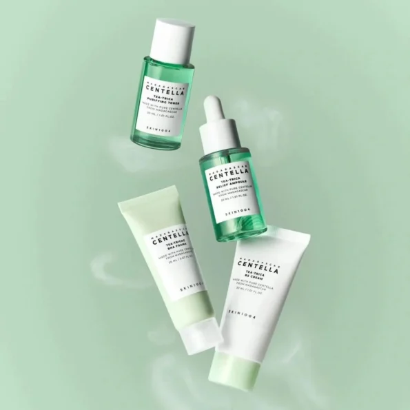 El SKIN1004 Madagascar Centella Tea-Trica Travel Kit incluye cuatro productos en tamaño viaje de la línea Tea-Trica, pensada para piel mixta o grasa que busca una rutina equilibrante.